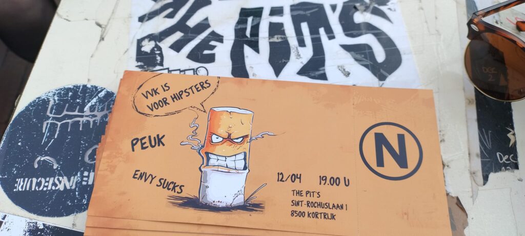 Straffe hipsters dan nog wel, want alleen verkrijgbaar in de Pit’s zelf (tijdens concerten en woensdagnamiddagen tussen 15h-18h), het Kortrijkse Crate Records of Flyer Tattoo’s And Illustration, ook in de Quickiestede uiteraard (die dan weer niet welkom is).