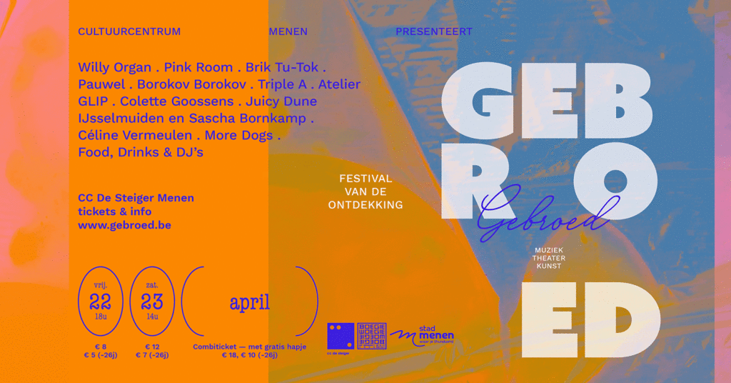 Het Menense Cultureel Centrum De Steiger wordt op 22 en 23 april een forum voor nieuwe theatermakers, muzikanten en andere kunstenaars onder de naam Gebroed. Op de derde editie staan op het menu een vijftal startende theatermakers, uiteenlopende muzikale top acts en diverse dj’s.