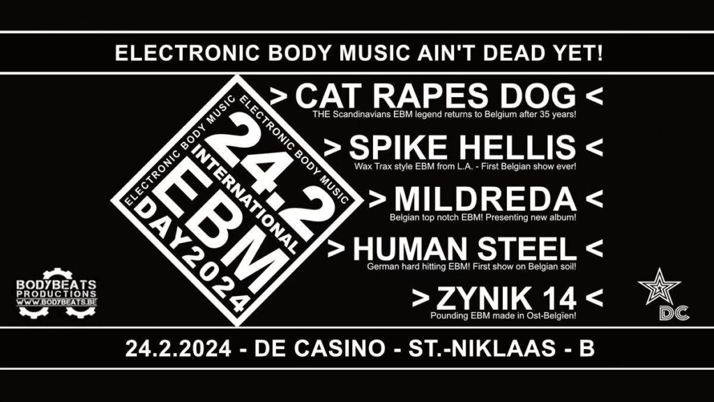Naar jaarlijkse gewoonte palmen ze met een knappe programmatie De Casino in Sint-Niklaas in. Je kan er gaan dansen op de beats van Zynik 14 (BE), Human Steel (DE), Mildreda (BE), Spike Hellis (USA) én on top of the bill de Scandinavische EBM-legende/ cultact Cat Rapes Dog. Dj Borg zorgt uiteraard voor een donderende afterparty.