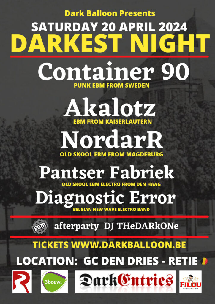 Snak je naar wat donkere beats? Dan moet je op 20 april (cijfermatig een mooie datum gekozen, trouwens, met die 20/04/2024) in Retie zijn, want daar organiseert Dark Balloon in CC Den Dries opnieuw een Darkest Night, met 5 electrostampende bands. Dark Balloon bestaat ondertussen 10 jaar en viert dit met deze zevende Darkest Night!