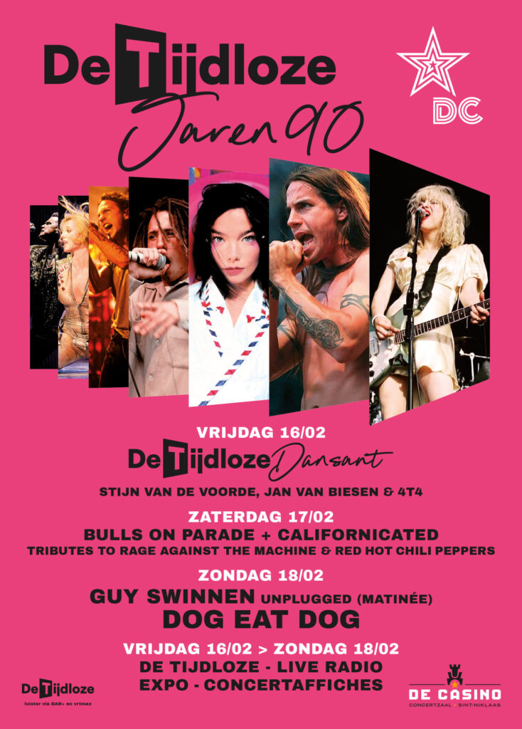 De Tijdloze en De Casino slaan van vrijdag 16 februari tot en met zondag 18 februari de handen in elkaar. Drie dagen live radio, een expo met concertaffiches, tickets en albumcovers, de Tijdloze Dansant, concerten van Dog Eat Dog en Guy Swinnen alsook een tribute night met Bulls On Parade en Californicated voor fans van Rage Against The Machine en Red Hot Chilli Peppers.