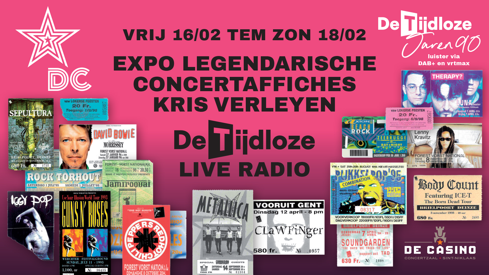 De Tijdloze en De Casino slaan van vrijdag 16 februari tot en met zondag 18 februari de handen in elkaar. Drie dagen live radio, een expo met concertaffiches, tickets en albumcovers, de Tijdloze Dansant, concerten van Dog Eat Dog en Guy Swinnen alsook een tribute night met Bulls On Parade en Californicated voor fans van Rage Against The Machine en Red Hot Chilli Peppers.