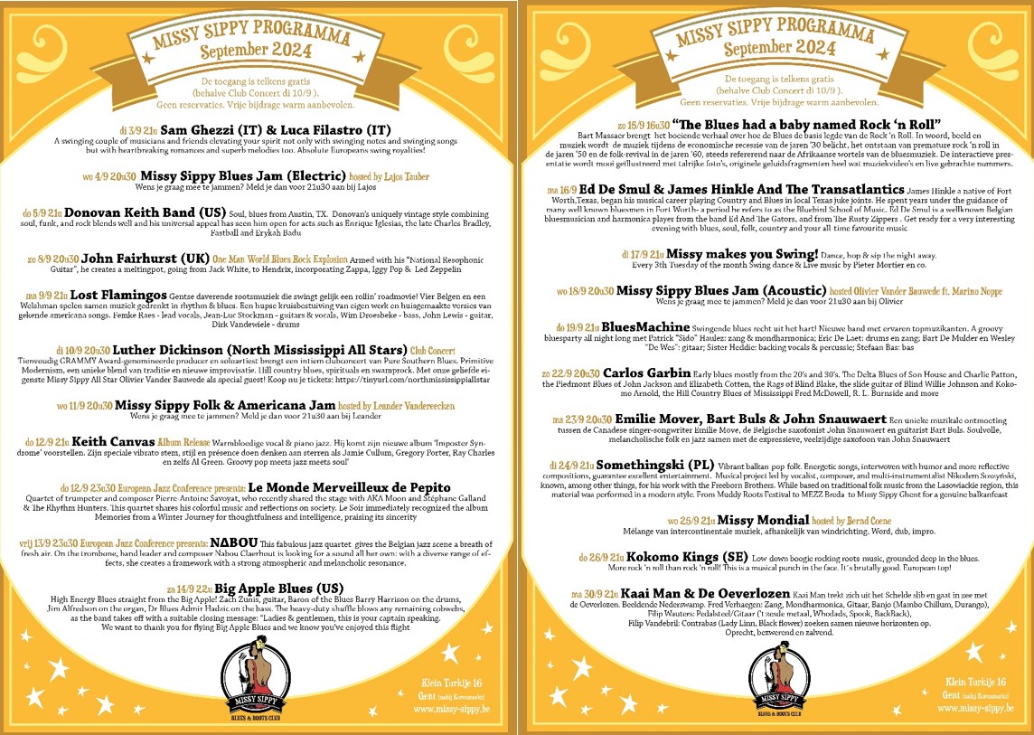 Het roffelt in de Gentse bayou met de geliefde sessies als de Folk & Americana Jam, Missy Sippy makes you Swing, Acoustic Blues Jam en Missy Mondial.
