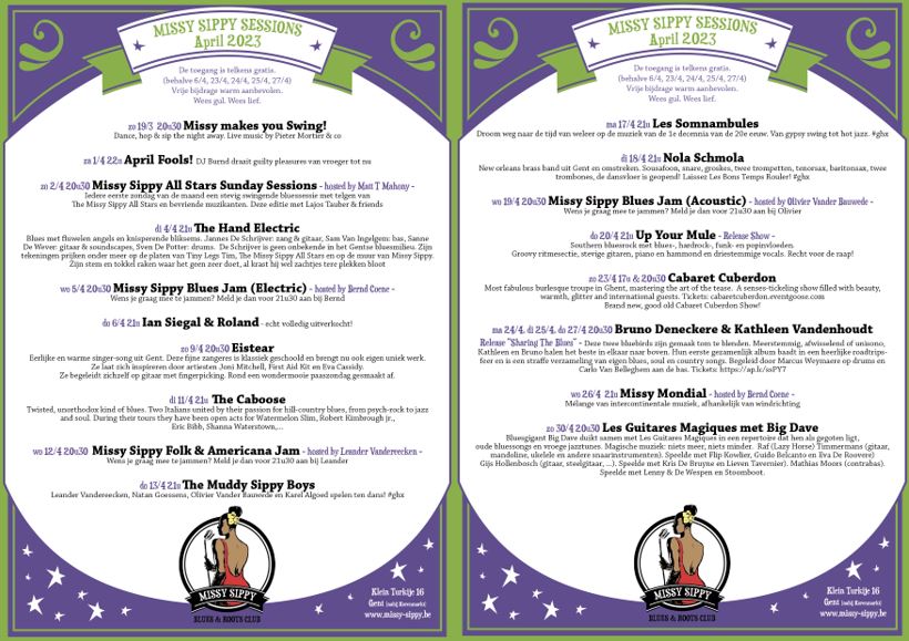 Ook april biedt heel wat moois in Missy Sippy Blues & Roots Club in Gent, met de gebruikelijke jamsessies, cabaret en live-optredens!