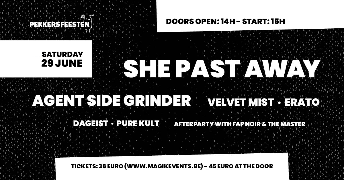 De organisatoren zijn zeer trots om met She Past Away als headliner te kunnen uitpakken. Deze Turkse postpunkband is een begrip in het donkere genre. Het kenmerkende gitaargeluid van het postpunktijdperk, gecombineerd met minimalistische poëzie in het Turks zorgen voor een uitbarsting van sentimentele angst. She Past Away klinkt stuwend en betoverend. Volkan Caner (gitaar en vocals) en Doruk Öztürkcan (keyboard en drum machine) garanderen een ongelofelijke live-ervaring!