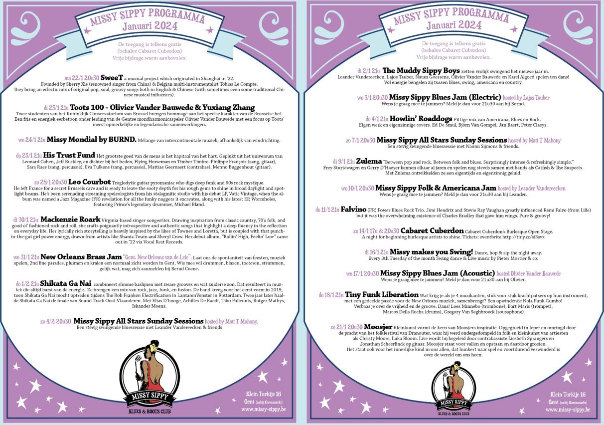 In de Gentse blues- & roots- hemel Missy Sippy wordt het jaar goed in gezet, met optredens van The Muddy Sippy Boys, Howlin’ Roaddogs, Zulema, Falvino, Cabaret Cuberdon, Tiny Funk Liberation, Moosjer, SweeT, Olivier Vander Bauwede & Yuxiang Zhang, BURND., His Trust Fund, Leo Courbot, Mackenzie Roark en Shikata Ga Nai.