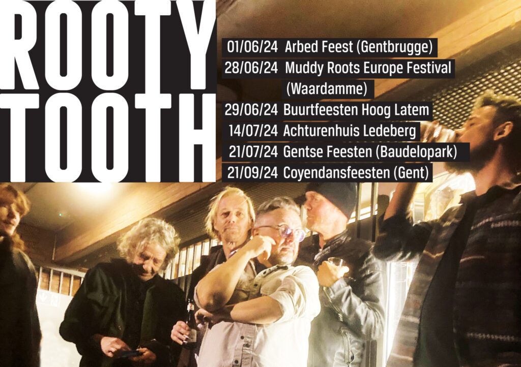 Rooty Tooth, blues en roots met de tanden bloot. Zo omschrijft de band zichzelf op facebook. Deze Gentse formatie rond frontman Ramblin’ Sam laveert tussen blues, bluegrass en outlaw country en zet zijn tanden in obscure country- en bluesnummers, maar ook ander werk met wortels in de Amerikaanse traditie, en blendt dit met eigen songs. Tijdens de zomermaanden staan er enkele live optredens op de agenda, waarbij ze onder andere het Muddy Roots Europe Festival mogen openen en tijdens de Gentse Feesten paraat zijn als één van de sfeermakers in het Baudelopark.