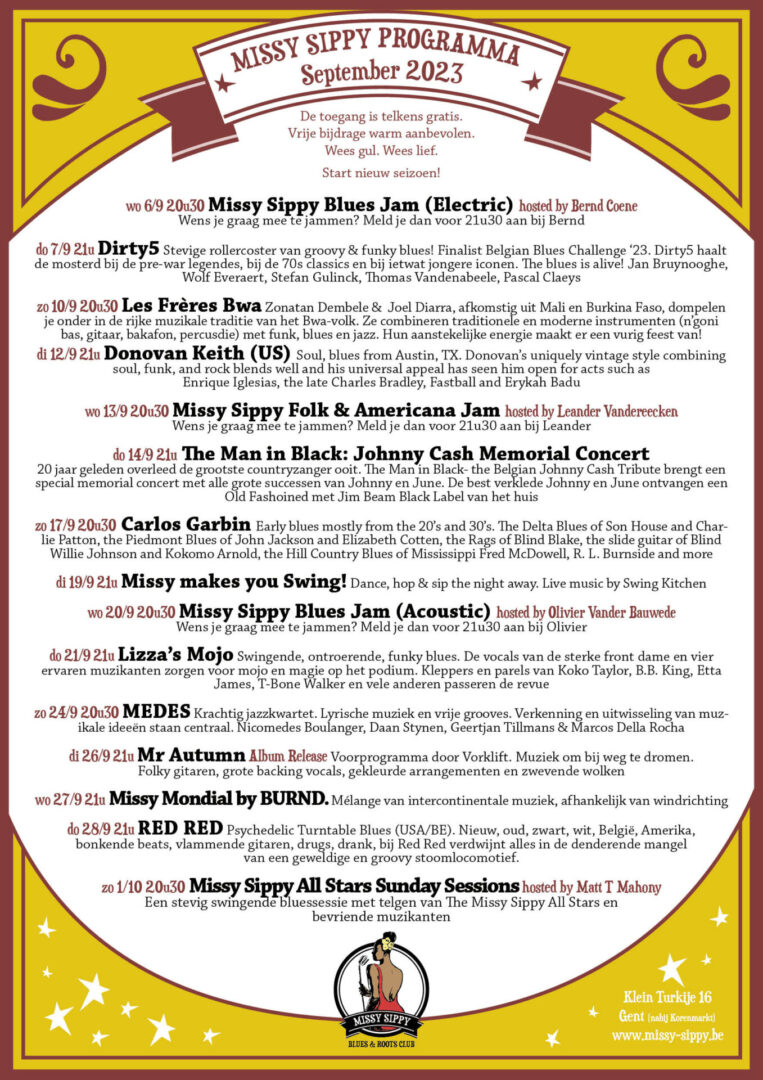 En dat vertaalt zich in een knap programma voor september, met de gekende jamsessies, de Missy Makes You Swing-avond, Missy Mondial, Missy Sippy All Stars Sunday, Session maar ook met optredens van Dirty5, Les Frères Bwa, Donovan Keith, Carlos Garbin, Lizza’s Mojo, Medes, Mr. Autumn en RedRed.