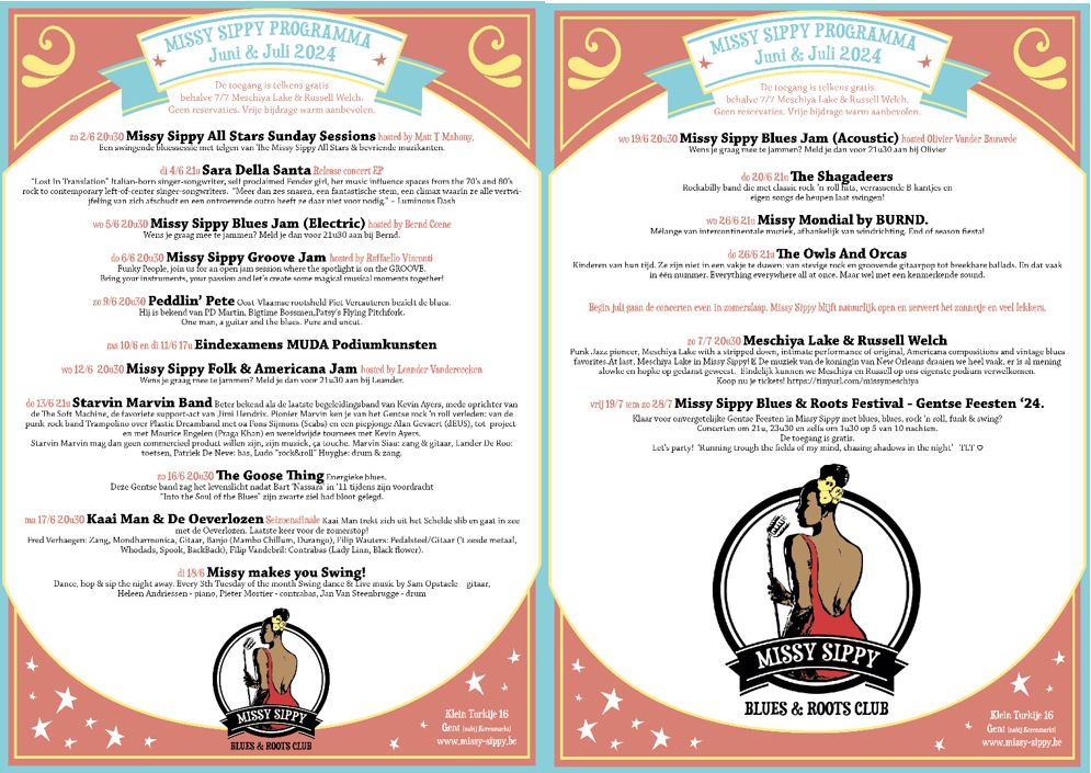 Je kan er genieten van de All Stars Sunday Sessions, Electric Blues Jams, Missy Sippy Groove Jam, Folk & Americana Jam, Missy Sippy Makes You Swing, Acoustic Blues Jam en Missy Mondial.