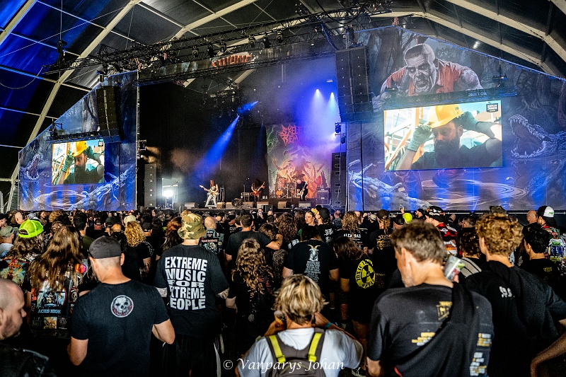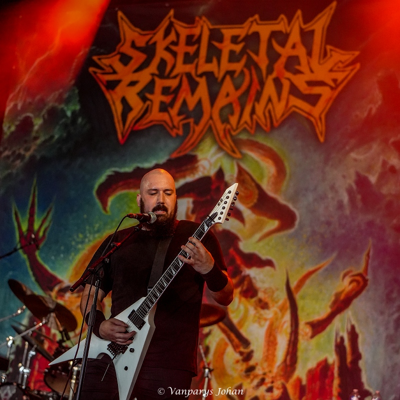 In de donkere, vochtige SWAMP bereidde Skeletal Remains zich voor om het publiek omver te blazen. De afgelopen jaren hebben ze zich gevestigd als voorvechters van de nieuwe golf Amerikaanse death metal. Vandaag konden we live genieten van nummers van hun nieuwste album, Fragments of the Ageless (2024). Hun optreden beloofde snoeihard te worden, precies zoals we het graag hebben.