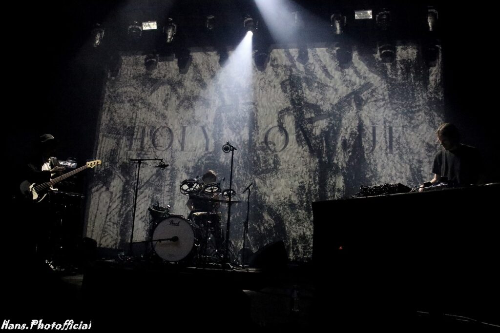 Terug aangekomen in de grote AB-zaal zagen we een sfeervolle backdrop die door de specifieke belichting een wazig reliëf vormde waarin de naam van de band gegraveerd stond en op dat podium zagen we de drie bandleden een erg gesmaakt optreden geven. Holy Tongue heet het trio waarbij de drumster centraal zat en geflankeerd werd door een gitarist en een geluidstechnicus/ dj aan een wel erg grote tafel. Deliverance And Spiritual Warfare verscheen vorig jaar en Oostendenaren konden hen vorig weekend nog aan het werk zien tijdens het festival Push The Button. Drumster Valentina Magaletti, afkomstig uit het Italiaanse Bari maar zoals zo velen werkend vanuit Londen, stond voor een zware opdracht tijdens BRDCST.