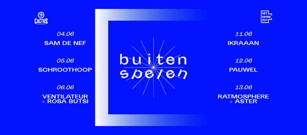 Met optredens van Sam De Nef, Schroothoop, Ventilateur, Rosa Butsi, Ikraaan, Pauwel, Aster en Ratmosphere is er voor ieder wat wils. Buiten Spelen vindt plaats in openlucht op de Entrepot site, volgens de coronaprotocollen die op dat moment gelden.