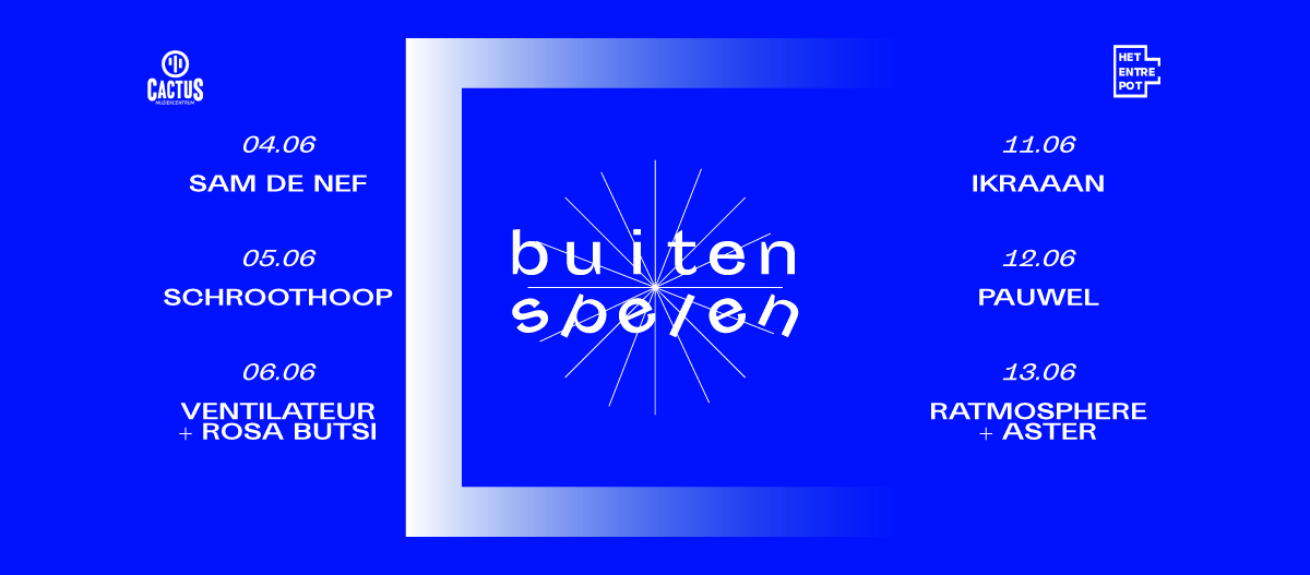 Met optredens van Sam De Nef, Schroothoop, Ventilateur, Rosa Butsi, Ikraaan, Pauwel, Aster en Ratmosphere is er voor ieder wat wils. Buiten Spelen vindt plaats in openlucht op de Entrepot site, volgens de coronaprotocollen die op dat moment gelden.