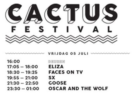 Belgen boven op Cactus dit jaar want de headliners waren telkens Belgisch. Op vrijdag werden de honneurs waargenomen door Oscar And The Wolf en dat ze daar in Brugge fier op waren was duidelijk want het werd al héél vroeg aangekondigd dat ze op de openingsavond zouden spelen. Op vrijdagavond staan er vaak wat meer frivole groepen op het programma. Vorige jaren waren dat bijvoorbeeld Grace Jones en Roisin Murphy. Ook vorig jaar was er een Belgische topper met Triggerfinger en nu dus Oscar And The Wolf. We zijn vaak te bescheiden in ons Belgenland, maar het moet gezegd dat Oscar And The Wolf, hoewel ze minder jaren op de teller hebben, helemaal niet moeten onderdoen voor die andere bands. Ze deden het ook al eens op Werchter Boutique en Pukkelpop en verkochten het sportpaleis twee keer na mekaar helemaal uit dus ja, Cactus inpakken: dat moest lukken.