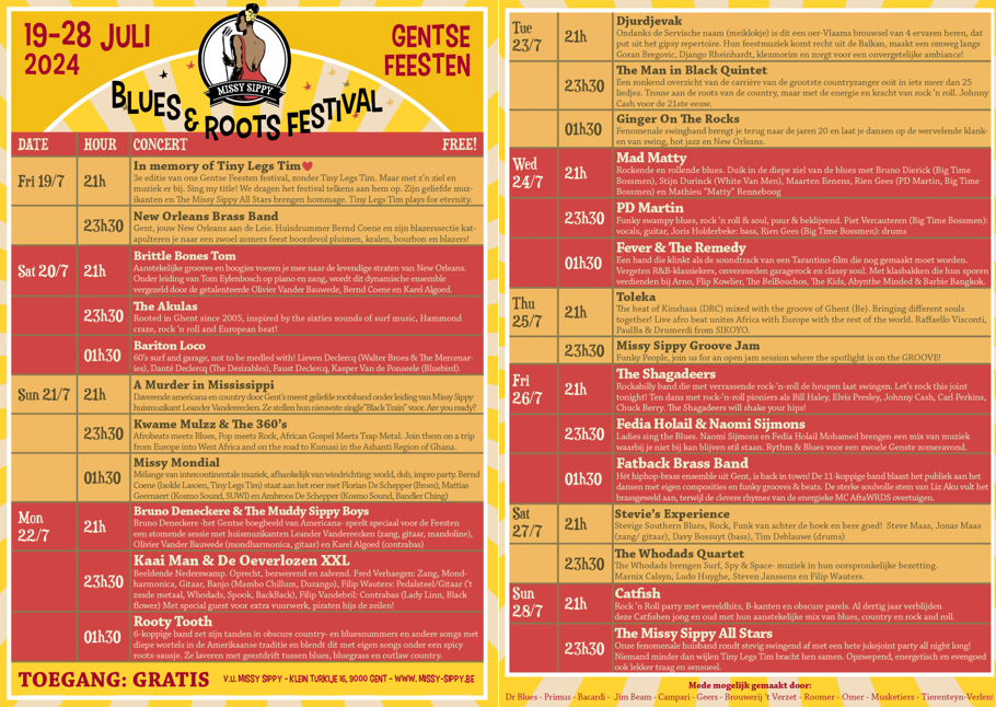 Tijdens de Gentse Feesten doen ze er met hun Blues & Roots Festival nog een schepje bovenop, met dagelijks concerten om 21u, 23u30 en zelfs om 1u30 op 6 van 10 nachten.