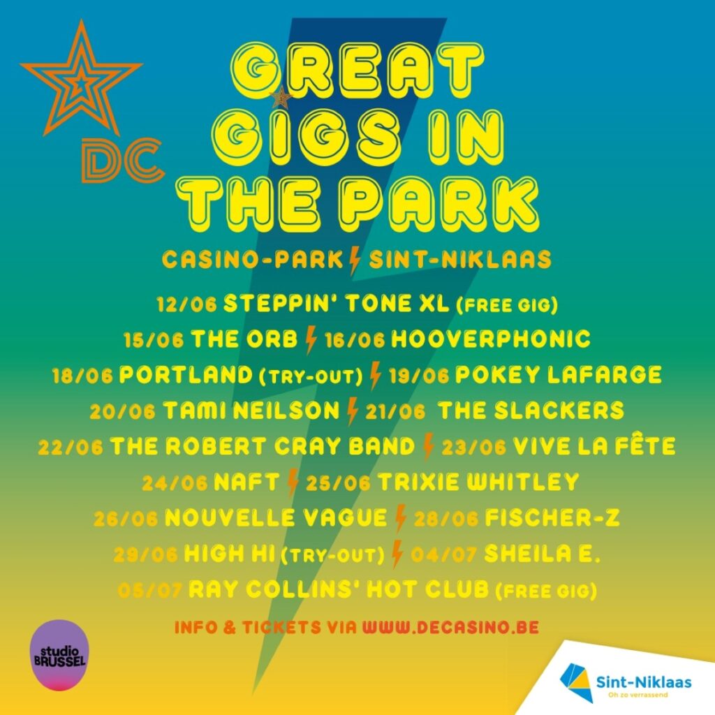 De Casino Concertzaal en het stadsbestuur Sint-Niklaas presenteren een vijfde editie van Great Gigs in the Park. Deze reeks openluchtconcerten, die plaatsvinden in de feeërieke setting van het historische Casino Park, wordt opnieuw gespreid over drie weken in het begin van de zomer en bundelt in die periode openluchtshows op de Casino-kiosk.