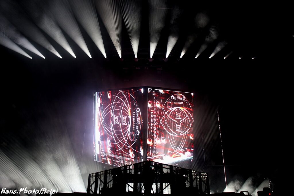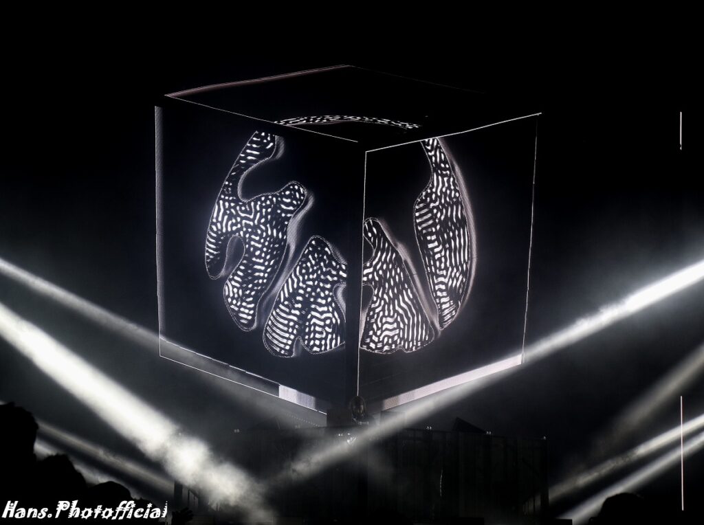 Aphex Twin begon aan zijn voetbalmatch (90 minuten speeltijd met name) in een behoorlijk indrukwekkende setting. Hij zat in zijn dj booth in een soort driehoek ingekapseld met boven zich een vierkant dat uit de ‘visual wall’ kwam gekropen waardoor het een soort gigantische blokkendoos leek. We gaan er van uit dat de visuals deel uitmaken van een uitgebreide cyclus waaruit hij kon kiezen, maar vast staat dat Aphex Twin geen aan- en uitknop heeft ingedrukt en dus niets voorgeprogrammeerd losliet op een aan de grond genagelde massa.
