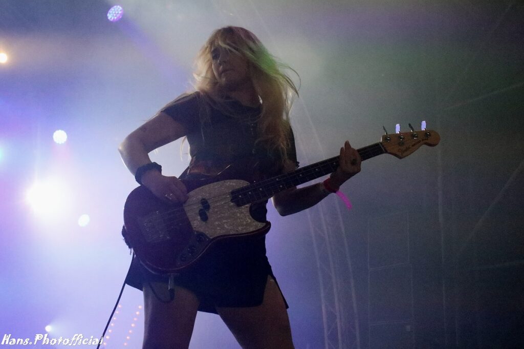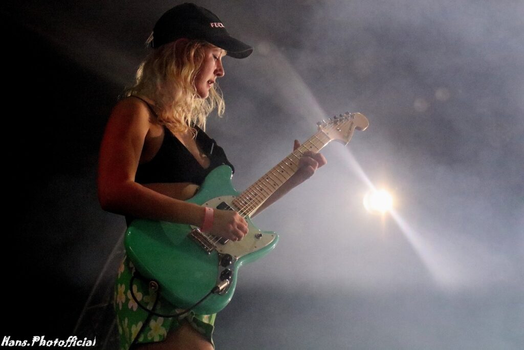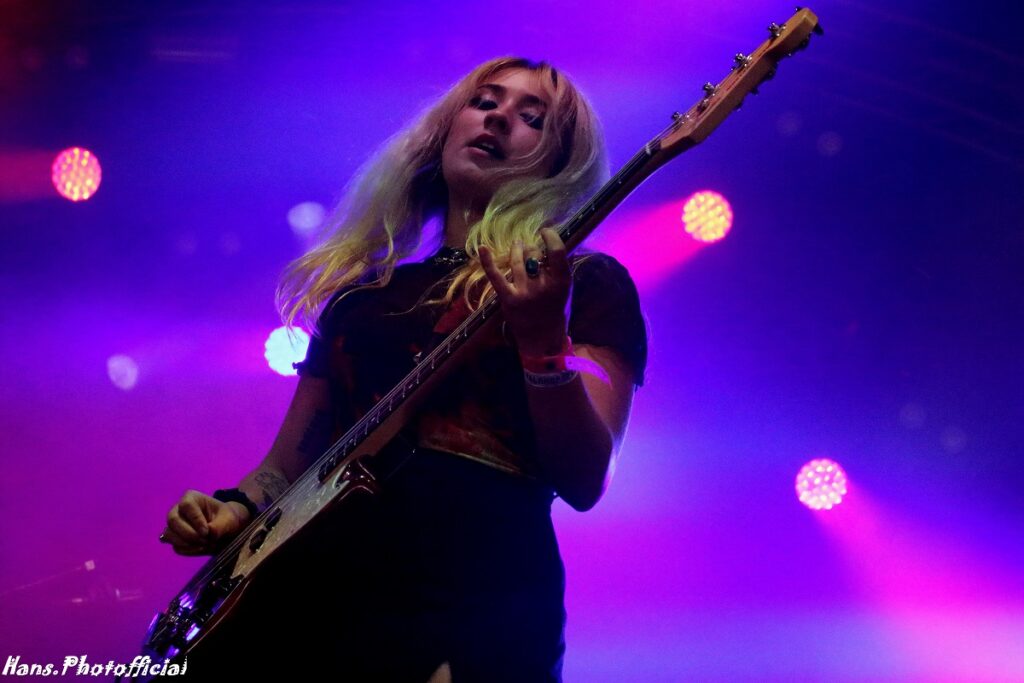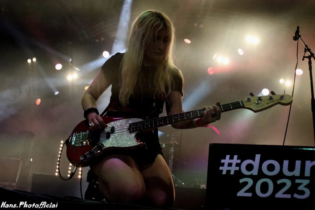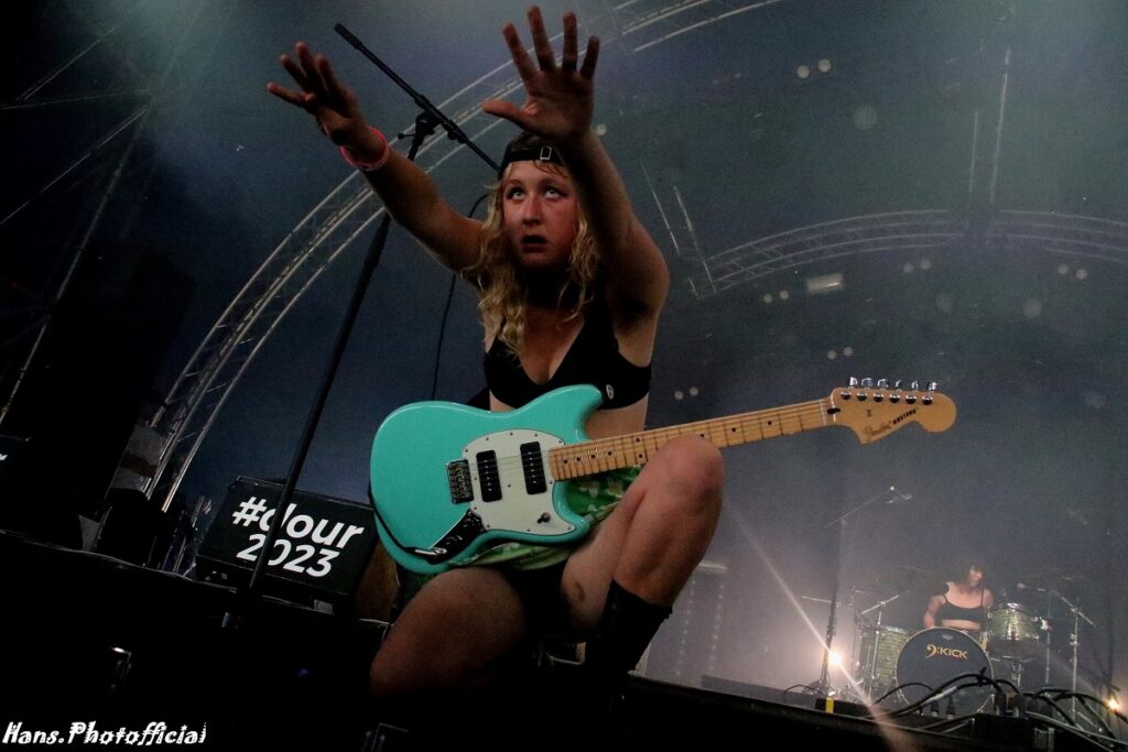 Het publiek at uit haar hand en amuseerde zich rot. Uitgelaten gezichten, een moshende menigte en alle armen en handen de lucht in! Rock-’n-roll rules, bitches! Phoebe moest lachen toen we haar na het optreden de titel ‘female Iggy’ toekende. Bij Lambrini Girls slaat het vuur de ene keer in de publiekspan, de andere keer braadt de haring niet. Op Dour was het memorabel. Phoebe zei hierover “This was the best festival audience to date”. Lilly lag ondertussen languit te bassen op een versterker in de frontstage. We konden met zijn allen de organisatie wel kussen uit dankbaarheid voor al dit moois.
