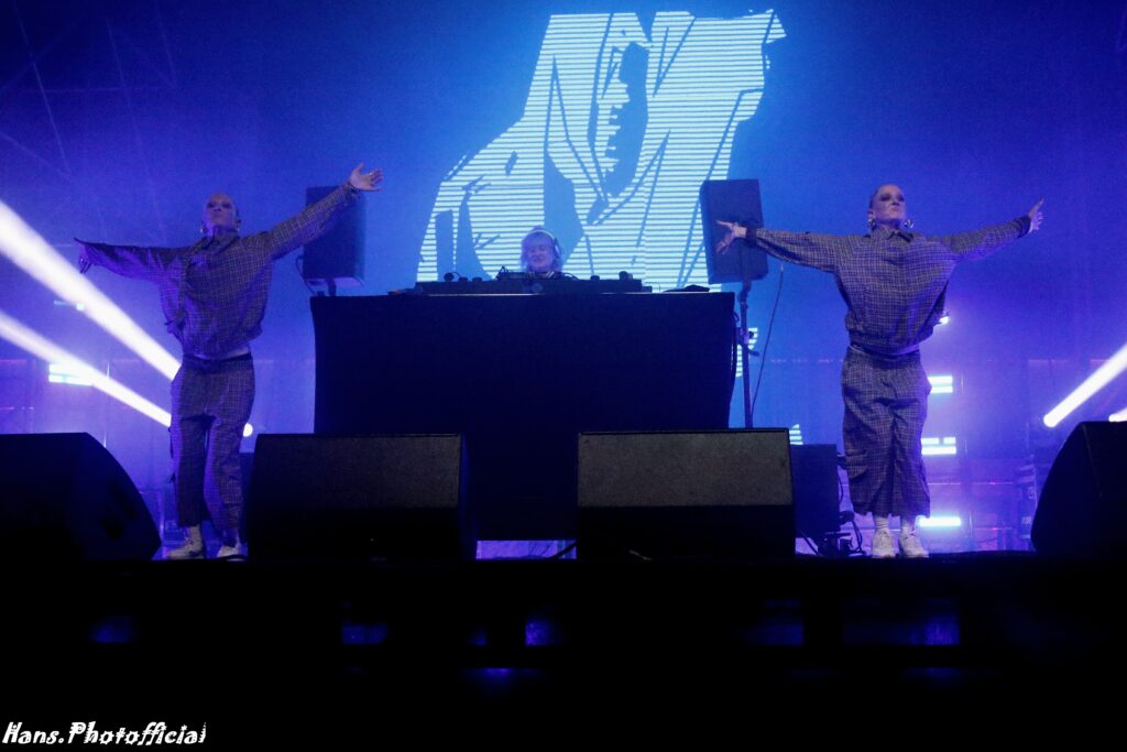 Squarepusher bracht ons terug naar La Petite Maison voor een niets ontziende set vanachter zijn favoriete tafel. Thomas Jenkinson is de grootmeester van de IDM en de drill & bass en spleet zijn analoge klanken keihard in onze maag met een voor epileptici erg gevaarlijk stroboscopenschouwspel. De uitermate opzwepende raveklanken zorgden voor een afgeladen volle tent maar we hadden niets anders verwacht. Wij kozen voor een iets ritmischer variant in de boiler room aka La Chaufferie. Daar trad Mandidextrous op. Die bracht My Bad Sister mee, een ééneiige tweeling uit East London Mandi Gordon, want zo heet Mandidextrous, is transgender en wil met haar muziek de transfobie voor een beetje de wereld uithelpen. Die muziek is drum & bass, house en jungle. En dat doet ze aan 190 beats per minute met een ‘come to daddy’-achtige androgyne tweeling die staat te springen, dansen en schreeuwen, maar wel perfect synchroon. Stilstaan is achteruitgaan en de Chaufferie had het geweten. De glimlach op Mandy haar lippen zei genoeg. Polly en Sophie Duniam zijn dan weer de stoute tweelingzusjes die tegen de covidvaccins en de restricties van de pandemie vochten, maar in het verleden wel naam maakten als danseressen bij The Pet Shop Boys. Het ging er knettergek aan toe, zowel op het podium als in de tent.
