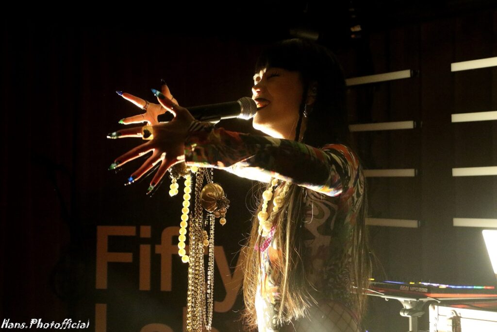 De organisatie liet eerder deze week 2 emoji-rebussen op ons los met hints naar twee surprise acts die op donderdag en vrijdag zouden optreden om 23u. Op donderdag was dezelfde Silver Space zaal in de Beursschouwburg aan de beurt als bij Deep Tan. We zagen plots heel veel bekend volk op het podium met ondermeer multi-intrumentaliste Nina Kortekaas (Admiral Freebee, Portland, Noa Lee), coming lady Jente Neels (Jen, Ratmosphere, Jan Verstraeten) en mellotroonpretendente Emily Vernaillen aan oogstrelende vrouwelijke zijde en bij de mannen Falk Schrauwen en Simon Segers (De Beren Gieren, Black Flower) en lichtvirtuoos Nils Tijtgat (Fortress). Dat kon dus maar één ding betekenen. Fifty Lab heeft één van de allergrootste namen uit rockend Vlaanderen gestrikt voor een exclusief concert van de enige echte Sylvie Kreusch met full band in een klein zaaltje.