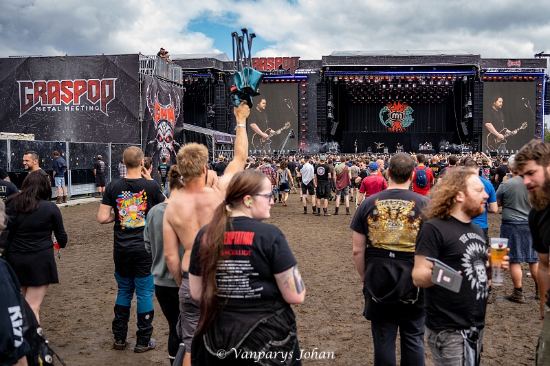 Na een sombere vrijdag liet de zon zich op zaterdag eindelijk weer zien. De organisatie van de Graspop Metal Meeting had alles op alles gezet om het terrein, dat door de regen in een modderpoel was veranderd, terug toegankelijk te maken. Ze brachten grote hoeveelheden gemaaid gras aan, die werden uitgestrooid over de modderige plekken.