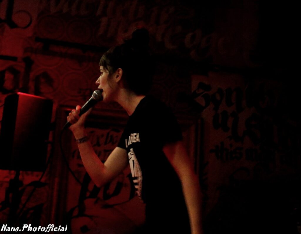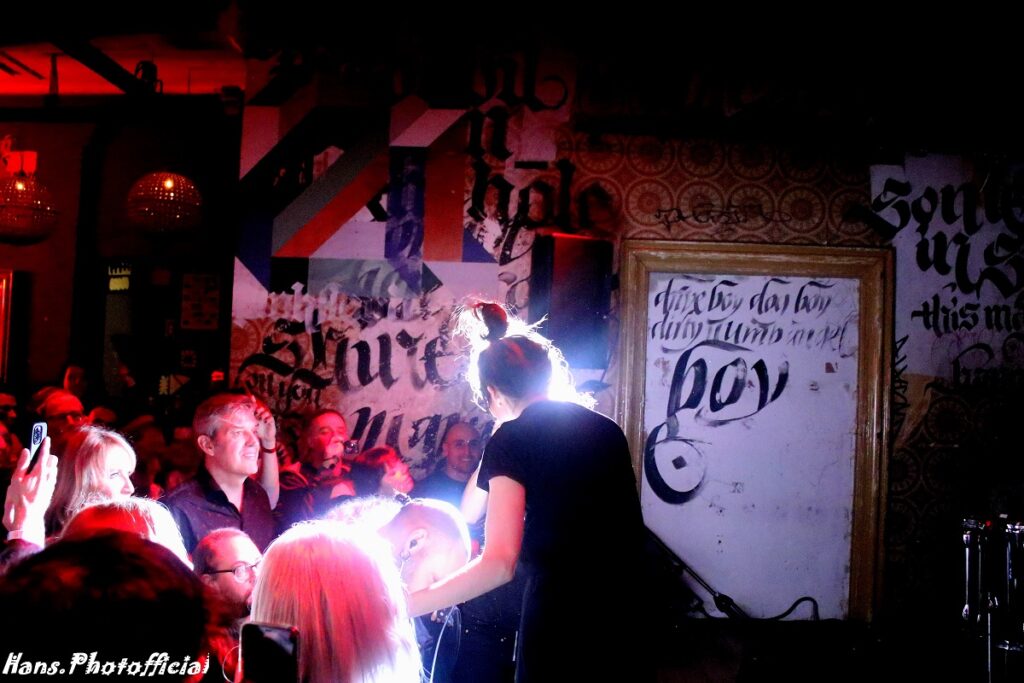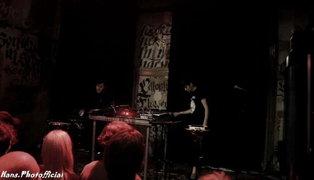 Lynks… hebben we dus lynks laten liggen, deels met spijt in het hart want vorig jaar was de springveer ronduit geniaal. Een klein stemmetje in ons fluisterde “ga naar het Paard café, daar treedt straks Dame Area op”. Totaal onvoorbereid begaven ons naar boven, en we waren niet alleen. Het café stond afgeladen vol en het was dringen en wringen om vooraan te geraken. Dame Area komt ook uit Barcelona, en het zijn Viktor L. Crux (synths, elektronica, percussie, drums) en de sensationele Silvia Konstance (zang, synths, elektronica) uit de Italiaanse Dolomieten. Wat zich dan afspeelde toen zij aan hun set begonnen is voor de geschiedenisboekskes. Gedimd rood licht in het café was het enige dat er voor zorgde dat het duo niet in volslagen duisternis stond te spelen, want op het podium was er geen licht. Silvia vertelde ons nadien dat dit geen bewuste keuze was, maar eerder ingegeven door de lichtinstallatie in het café.
