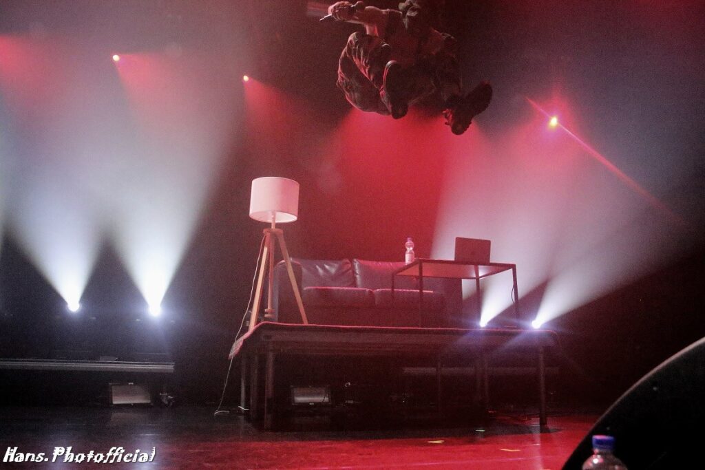 Waar hij vandaan komt is niet meteen te achterhalen, feit is dat hij een achtergrond als professioneel danser moet hebben want hij stuiterde, sprong, rolde en dook over het podium met zoveel flair en gemak dat het leek op topsport. De vlam sloeg meteen in de pan met een nummer dat hij aankondigde als een verminking van een nummer van Courtney Barnett. Pedestrian At Best was inderdaad een speciaalke maar de versie was geniaal. Elke song kreeg een mooie introductie die steevast grappig was. Everyone’s Hot (And I’m Not) werd aan het sexy publiek opgedragen dat hij zo aantrekkelijk vond dat hij niet eens durfde kijken. Ook Hey Joe, Relax passeerde de revue. Na elk nummer ging hij op de salontafel of de sofa liggen om een volgend nummer op te starten op zijn laptop. “Why do I always lay down when I have to get up immediately?”