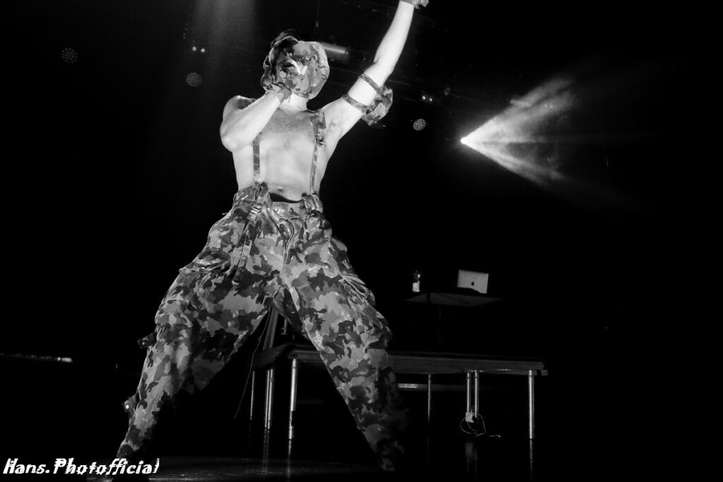 Lynks Afrikka is een rijzende ster uit Bristol UK en brengt avant-garde techno en punk uit een bakske, lees Apple laptop. Hij is natuurlijk lang niet de enige die zich over dit genre ontfermt. Zichzelf omschrijft hij als een he/she/they en hij rondde net zijn “best musician in the world UK tour” af. We lagen al plat van het lachen tijdens de soundcheck toen hij over het podium huppelde in The Sound Of Music stijl terwijl hij luidop riep “this is a soundcheck”. Na de startknop te hebben ingedrukt nam hij plaats op zijn klein podium op het grote podium waarover hij dit wist te vertellen. Normaal heb ik 3 geweldige danseressen mee, maar ze hebben allemaal covid. Mijn manager heeft ook covid. Mijn leven stelt niets voor. Ik ben heel alleen en heb dan maar de meubels uit de green room op het podium gezet. Ik heb 3 meubels meegebracht en dit zijn nu mijn danseressen. De lamp is Ella, de zetel is Laura en de salontafel is Kate. Zijn eerste ep in 2019 heette Smash Hits, volume 1. Doe het hem maar na!