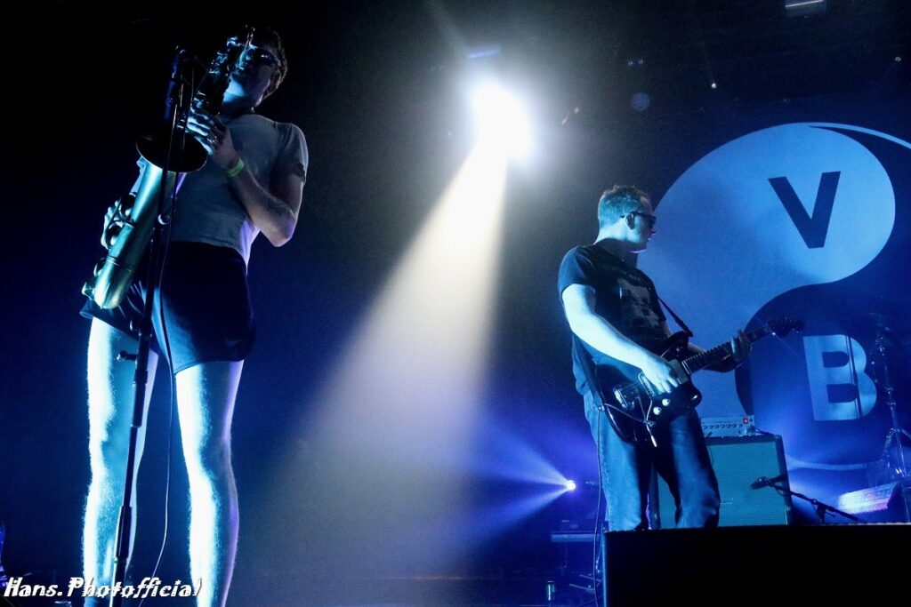Nog meer oponthoud bij de terugweg naar Viagra Boys want wie liepen we tegen het lijf aan het Paard? Bassiste Halle Saxon Gaines van Automatic jawel! Ze vertelde me dat we nog niet veel hadden gemist omdat het in de zaal ‘pretty hectic’ was wegens PA-problemen. Die waren ondertussen opgelost en we belandden middenin een Viagra Boys feestje op kruissnelheid. Het podium leek wel een slagveld met veel ongeopende flesjes koud plat water en alleen maar leeggedronken blikjes Grolsch bier (bier uit Groenlo in Gelderland, ver uit de buurt dus). Af en toe lag daar een ogenschijnlijk stomdronken Sebastian Murphy tussen. De enige uit dit Stockholmse postpunkcollectief die geen archetypisch Zweedse naam draagt. Geef toe, Oscar Carls (sax) en Tor Sjöden (drums) klinken een pak Scandinavischer. Murphy klinkt in feite vooral Iers en het zuipfestijngedrag van vrolijke Seb verraadt Iers bloed.