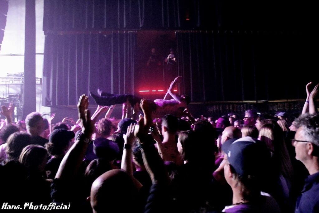 Murphy lag tijdens het laatste half uur meer neer dan iets anders, ofwel lag hij een gedicht af te drammen op de grond, ofwel surfte hij letterlijk mee op de golven van het uitzinnige publiek. ‘Stiepelzat’ of gewoon een gimmick, een strategische zet? Zijn lichaam stond ook even in de kijker want hij verontschuldigde zich even voor zijn exhibitionistisch kantje. “I am not going into every detail of my athletic body since my favorite hobby is sports” was de ideale weggever om te beginnen pompen en de band Sports te laten inzetten. Na een tiental keer pompen ging het licht onverbiddelijk uit. Heel entertainend allemaal maar het haalde de aandacht wel weg van de strakke en straffe songs maar dit is gezanik in de marge. Viagra Boys stonden stijf (jaja) van de adrenaline en het publiek was door het dolle heen. Missie volbracht.