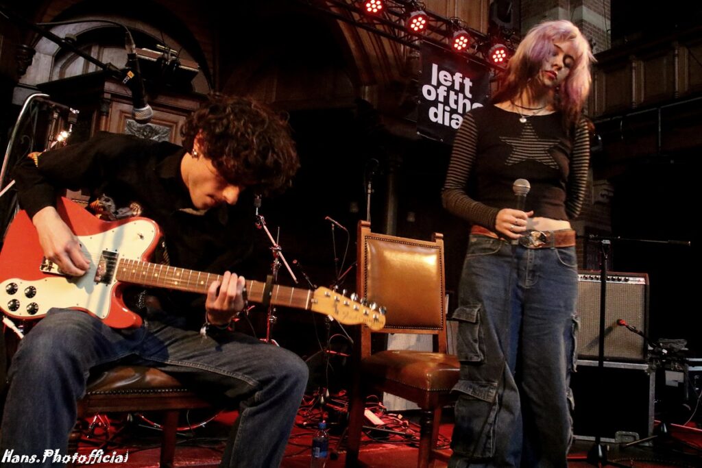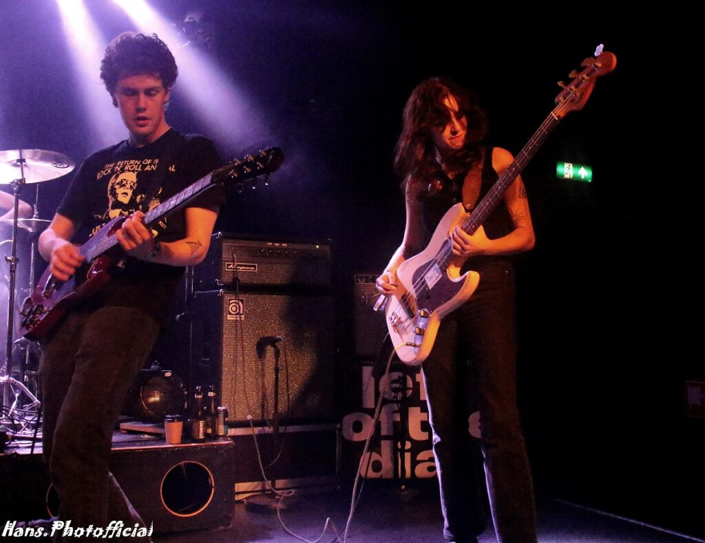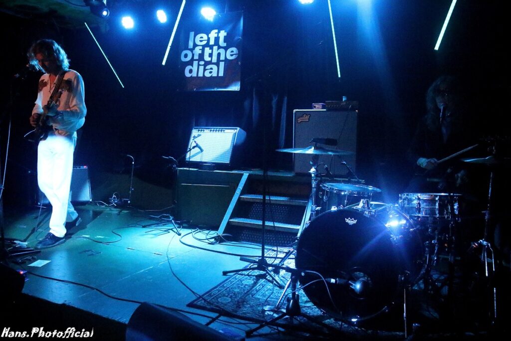 Op zaterdag, de laatste dag van Left Of The Dial 2023 konden we ook wat tijd uittrekken om een blik te werpen op het “official unofficial Left Of The Dial”-programma waarbij een aantal optredens op het schip plaatsvinden en een paar andere in een aantal vertrouwde zalen alvorens om 16u de derde dag officieel op gang gefloten werd. Zo gingen we voor het eerst – en meteen ook voor het laatst – een kijkje nemen in het geweldige Vessel 11, de V11 zoals die bijna liefkozend wordt betiteld. De aan Stadshaven aangemeerde knalrode rockboot met een podium op het benedendek ontving er rond de middag het artpoprock duo 250CC uit Berlijn. Guido Giorgi laat zich op gitaar bijstaan door de Franse drumster Alice Huet. Berlijn loopt kennelijk vol Engelsen, Italianen en Fransen. Guten Tag allen! We zagen enkel het laatste deel van hun optreden, maar de energie spatte toch van het kleine podium.