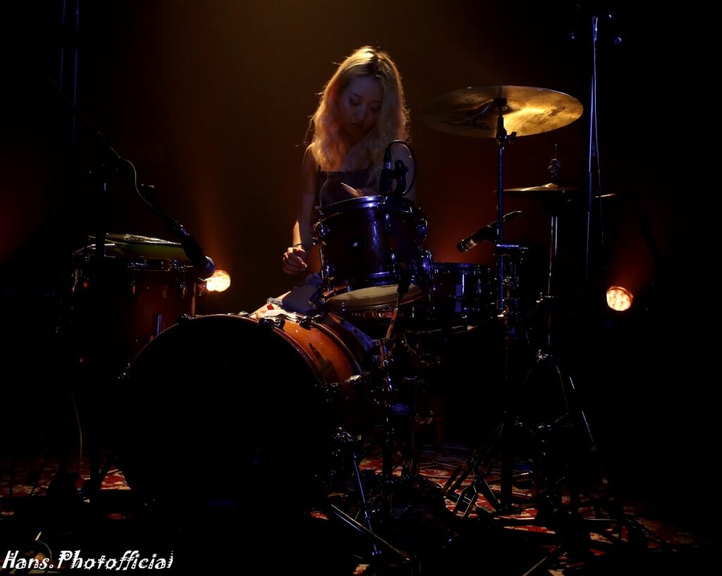 Op één van de drumtrommels lag een sampler keyboard waaruit ze vaak geflipte begeleidende noise puurde en op een andere trommel legde ze soms haar voet. Ze mepte vooral de cimbalen aan gort hoewel ze rondkeek met een gemak alsof ze de kruimels uit een keukenhanddoek schudde. Toen we haar nadien feliciteerden en vroegen of ze niets in haar frêle armen voelde antwoordde ze verlegen: “Thank you”.