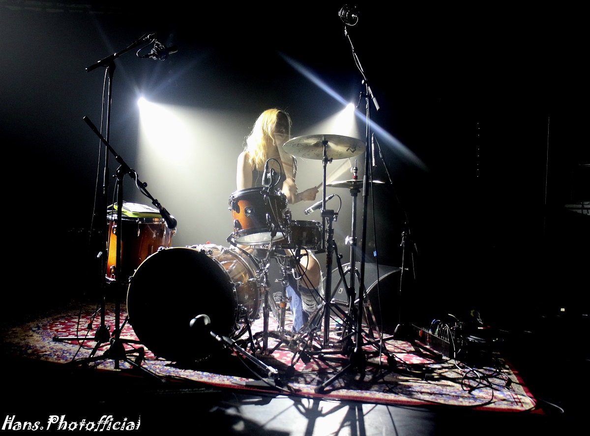 Op één van de drumtrommels lag een sampler keyboard waaruit ze vaak geflipte begeleidende noise puurde en op een andere trommel legde ze soms haar voet. Ze mepte vooral de cimbalen aan gort hoewel ze rondkeek met een gemak alsof ze de kruimels uit een keukenhanddoek schudde. Toen we haar nadien feliciteerden en vroegen of ze niets in haar frêle armen voelde antwoordde ze verlegen: “Thank you”.