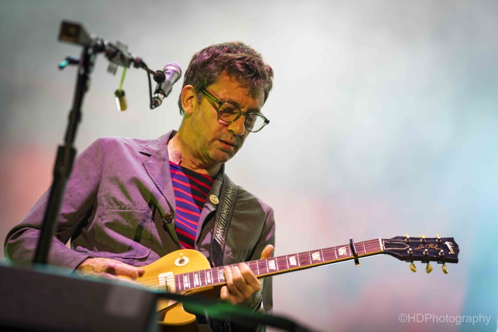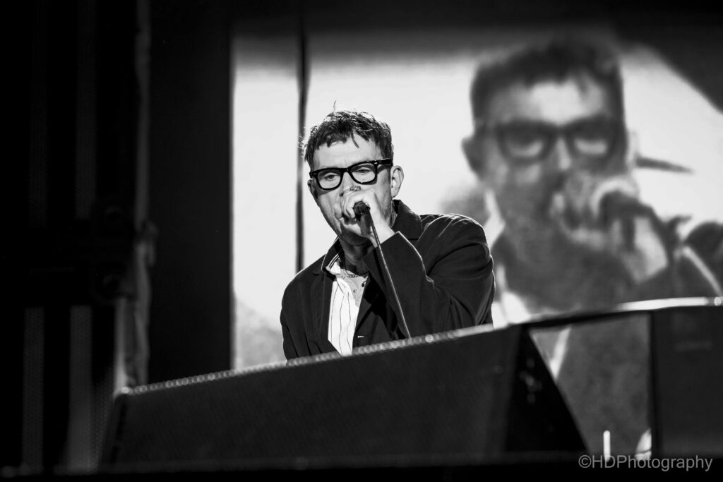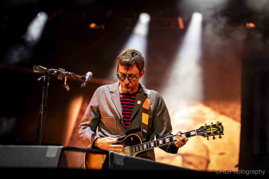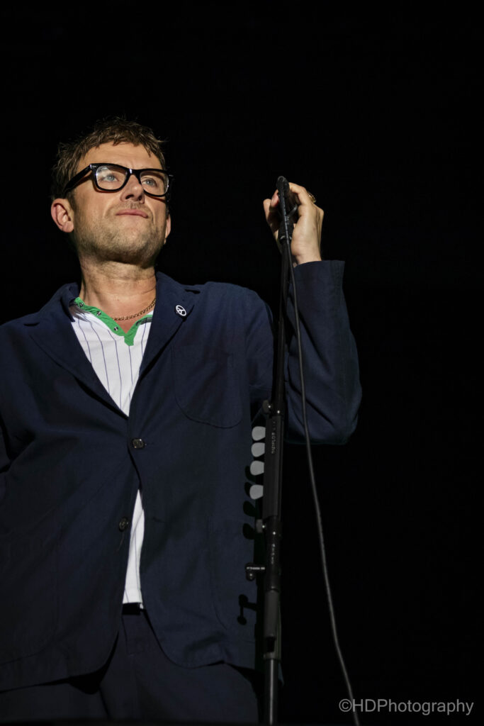 Blur kwam om kwart na tien het podium opgestapt. Neen, gewoon gestapt inderdaad. Ze kwamen niet uit de grond naar boven of werden niet via UFO’s met vuurspuwende tongen afgeleverd aan bloeddorstige fans. Het waren ‘just four regular lads from the UK’ die anderhalf uur lang samen liedjes wilden spelen en zich ondertussen kostelijk zouden amuseren. Het lichtgevende paneel met de letters van de band waren met een occasionele backdrop de enige visuals waarop ze beroep deden. Blur liet de muziek voor zich spreken, ruim anderhalf uur lang waarbij ze het ene geniale tijdloze nummer na het andere brachten.