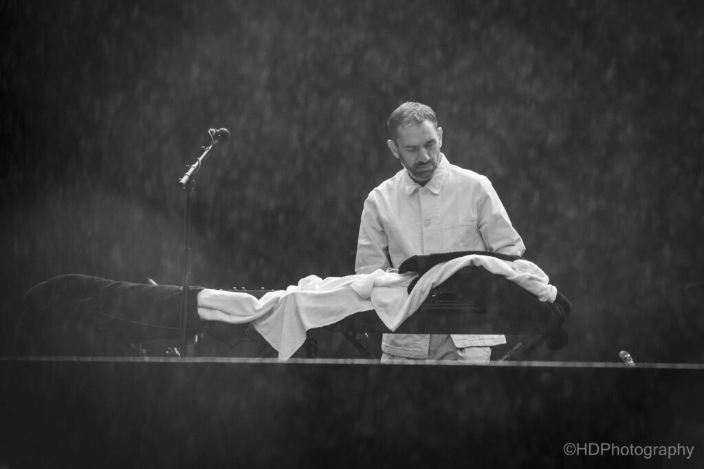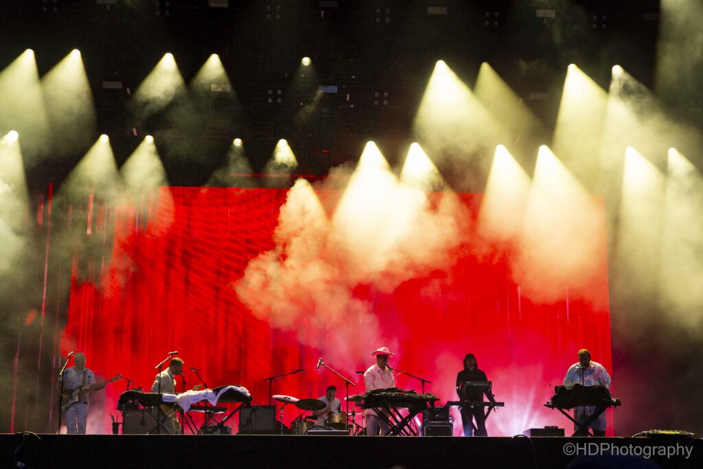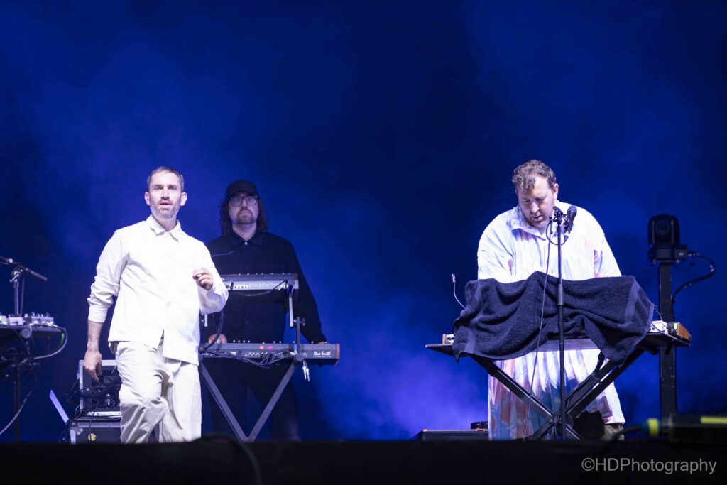 Ondertussen was het buiten hard aan het regenen, niet meteen de gedroomde setting voor een optreden van Hot Chip. De felle regen had – behalve de logica zelve dat iedereen nat werd en meer bezig was met het positie innemen voor Blur – een negatieve visuele impact op het podium. Het viel al op bij Baxter Dury, maar nu zeker. De instrumenten stonden ter bescherming tegen de nattigheid vrij diep op het podium waardoor de bandleden vanuit de frontstage en de eerste tientallen rijen eigenlijk nauwelijks zichtbaar waren. Dury compenseerde door vooraan post te vatten. De synthpopartiesten uit Londen deden zich op papier wel voor als hete patatjes, maar ze blonken nogal uit in een verregaande staat van lethargie.