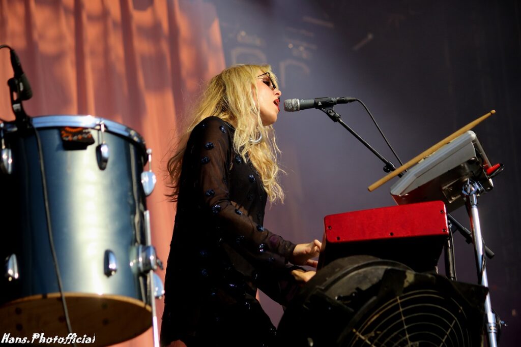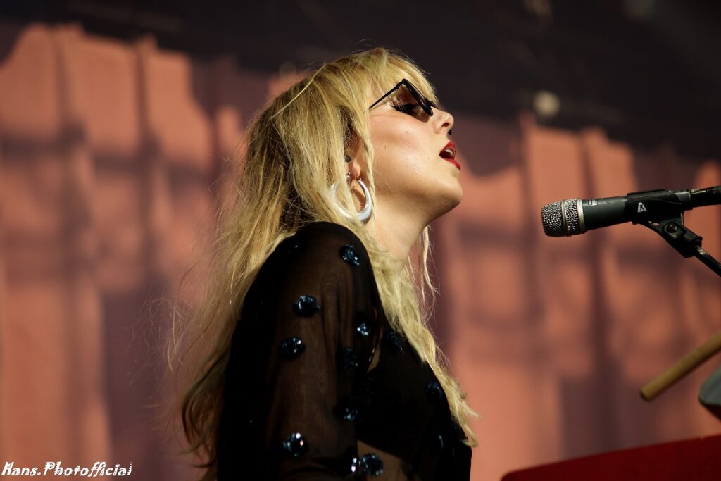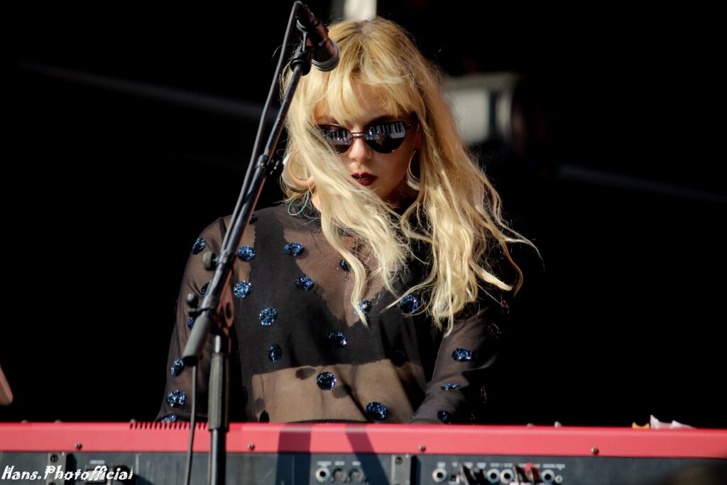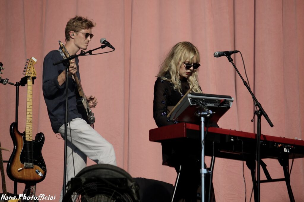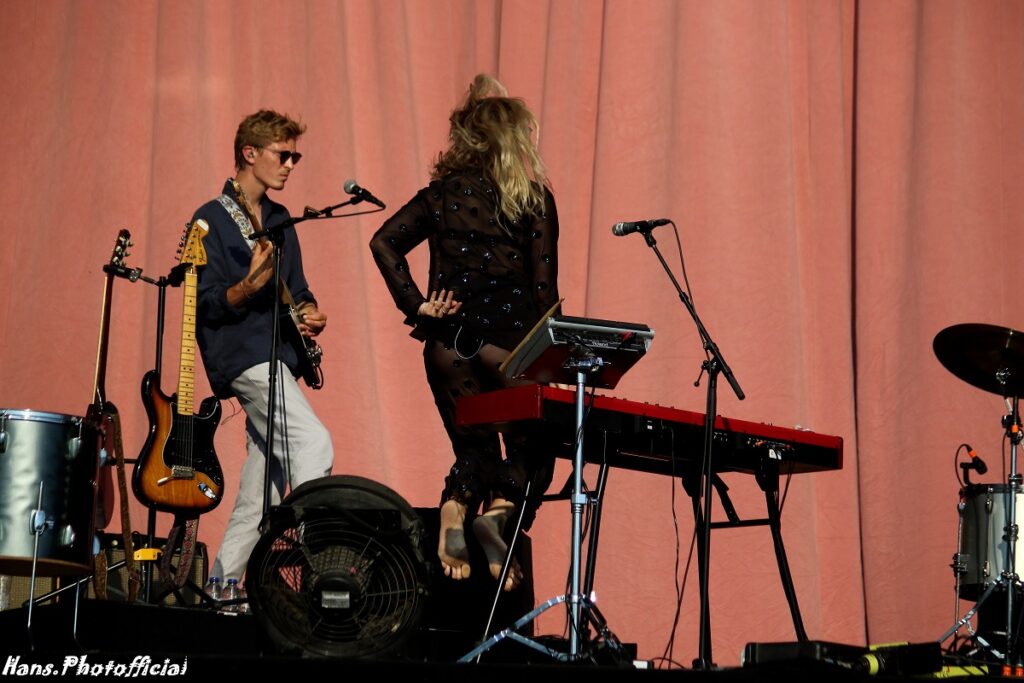 Laten we deze avond gemakshalve de Lokerse rockavond noemen en het was dus wel wat afwachten hoe een in avondzon badende Kaai zou reageren op het optreden van Portland. Portland is een stad in het noordwesten van de staat Oregon maar vooral de band rond Jente Pironet en Sarah Pepels. De mooiste lichtshow was die van de opener op de mainstage want een tropische avondgloed zorgde voor een heerlijk warm licht op het podium. De synths en drums waren in de aanloop naar het concert afgedekt met hittedekens, I kid you not, en de voltallige band werd zachtjes gegrild alsof ze als Lokerse paardenworsten tussen een broodje geschoven dienden te worden na afloop van de set. Sarah koos niet onverstandig voor een zonnebril. Portland situeren we vooral in zaaltjes, met intiemere settings die passen bij de richting Beach House afdwalende composities. Hoe deden ze het op de Kaai met een reeds rockhongerig en half gemarineerd publiek dat al massaal was ingecheckt?
