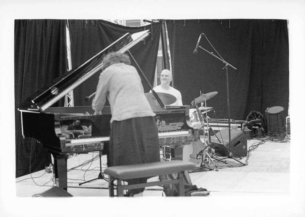 Vreemde geluiden ontsproten nu en dan aan het snaarinstrument en een blik in de klankkast van de piano liet enkele interessante en verrassende aanpassingen zien. Maar ook Thielemans liet zich niet onbetuigd als het ging om alternatieve manieren om de drum te bespelen. Schotels, schaaltjes, een leeg blikje cola, stevig uit de kluiten gewassen Mikado stokken, verfrommelde stukken papier… het passeerde allemaal en het klonk wonderlijk en spannend. Want spanning daar draait het toch voor een groot stuk om bij dit soort improvisaties, niet alleen voor de muzikant maar ook voor het publiek.