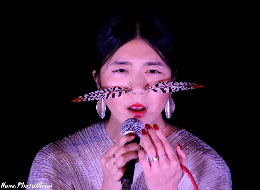Ze raakte als tiener gefascineerd door monnikengezang in Nepal en liet zich verder inspireren door opera, Björk, Gregoriaanse en Bulgaarse gezangen. Op een unieke wijze laat ze in haar songs de natuur integreren en samensmelten met wat ze doet. De enige song waarin ze de natuur niet op natuurlijke (sic) wijze nabootste met haar stem was Inori. Hier werd ze versterkt met geluidsopnames van de oceaan aan de kust van Fukushima waar ze op bezoek was en onder de indruk raakte van de diepe emoties die daar loskwamen na de doortocht van de tsunami in 2011. Ze wandelde door een verduisterde zaal en werd schaars opgelicht wat de rouwstoetmodus spookachtig mooi versterkte. Ze was ook de enige artieste die ruim de tijd nam wat toelichting te geven bij wat gebeurde en bij wat iedereen hoorde en zag. Het charisma van Hatis Noit was fenomenaal. Haar dankbaarheid was ook nu weer van dezelfde grootteorde want ze herinnerde zich nog de passage op Sonic City, in hetzelfde Kortrijk van hetzelfde Wilde Westen. Het was – om precies te zijn – de laatste Sonic City vóór King Covid op de troon kwam.