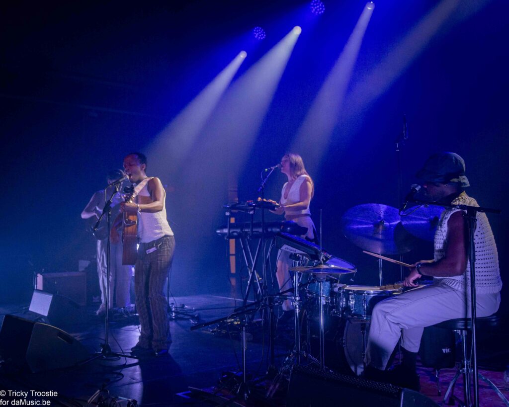 We waren net tijd op post om de soulvolle set met veel melancholie en oprechtheid van IKRAAN mee te pikken, vooraan in de kerk, die haar jongste – terecht bejubelde – album Schemerlicht (2024) zou voorstellen. De jonge artieste liet zich vergezellen door drie Franse muzikanten die ze nog niet zo goed kende “zij begrijpen niet wat ik zeg, en ik versta hén niet”, grapte Ikraaan. En toch pakte de mayonaise tussen de percussionist, de gitarist/bassist, de keyboard-wizzard en de jonge zangeres meteen; goed op elkaar ingespeeld alsof ze altijd al samen musiceerden.