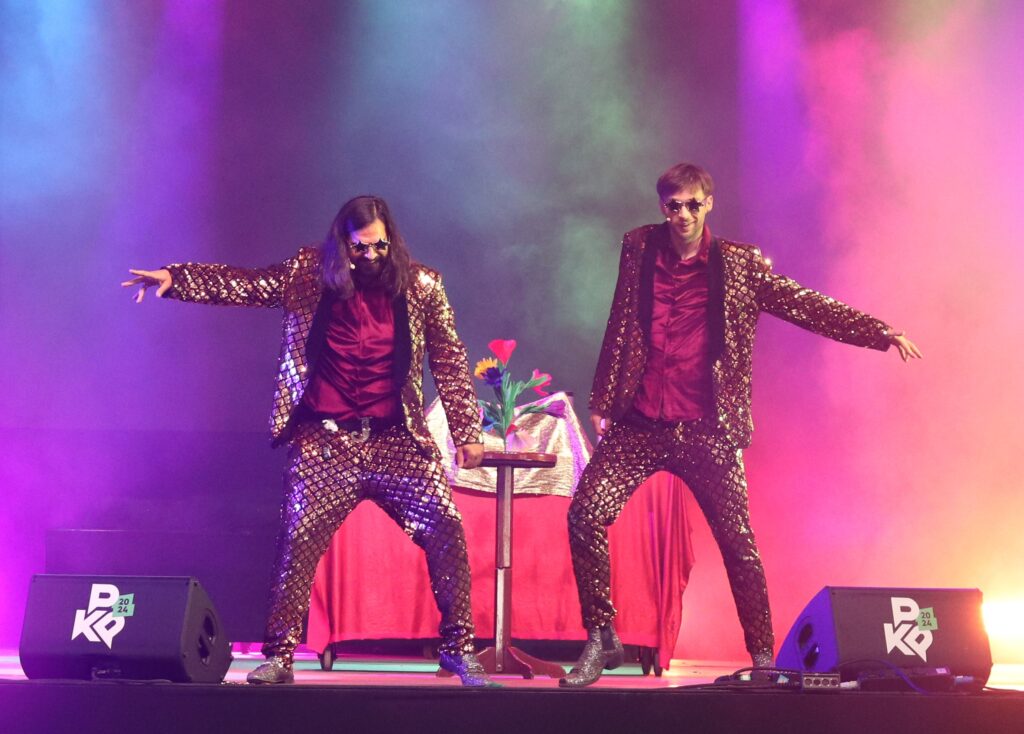 Kan men beter wakker worden met een frisse pint en/of koffie in de hand, lachsalvo’s afvurend bij onze Duitse vrienden Siegfried & Joy? Ze hadden zichzelf reeds een vijftal keer onaangekondigd aangekondigd een half uur voor het werkelijke startuur van hun Hollywood-show, waar ze voorlopig nog niet mee buiten de Europese grenzen zijn geraakt, bulkend van absurdisme en nonsens. Het tweetal verovert momenteel de socials met pseudo-mislukte verdwijnpogingen en krijgt bijval in vele landen. Kaarttrucs en illusionisme doorspekt met onnozelheid liepen op het eerste zicht in het honderd., toch kwamen ze meestal op hun voeten terecht. Siegfried of Joy, was deze ochtend gaan vissen en toverde op onverwachte momenten gigantische vissen vanonder zijn kledij. Ook een levensgevaarlijke pluche tijger bedreigde het zittende publiek, maar werd tijdig terug naar Planckendael gestuurd, en hilarische buikspreekacts met uit het publiek geviste slachtoffers lieten ons glimlachen tot achter de oren. Siegfried is een ‘joy’ om naar te kijken, zijn vriendje was minstens evenwaardig. Met een verdiend boeket kunstbloemen stuurden we ze huiswaarts.
