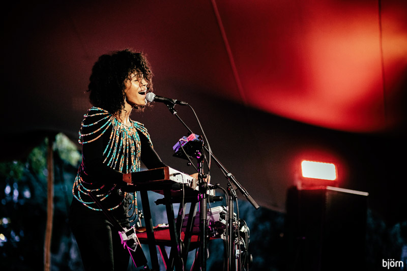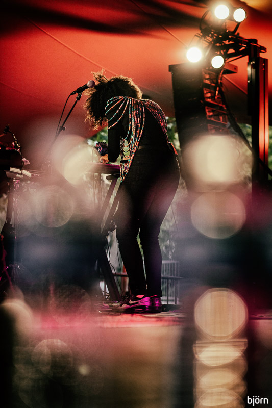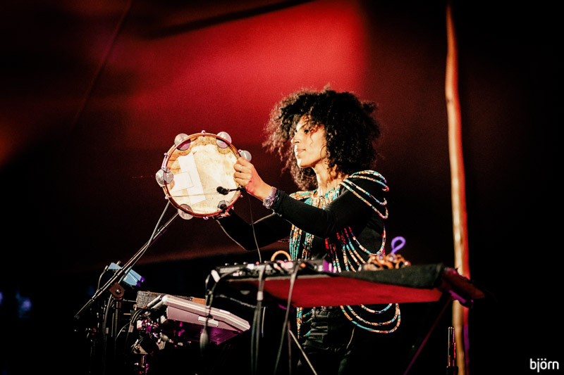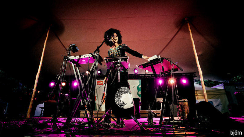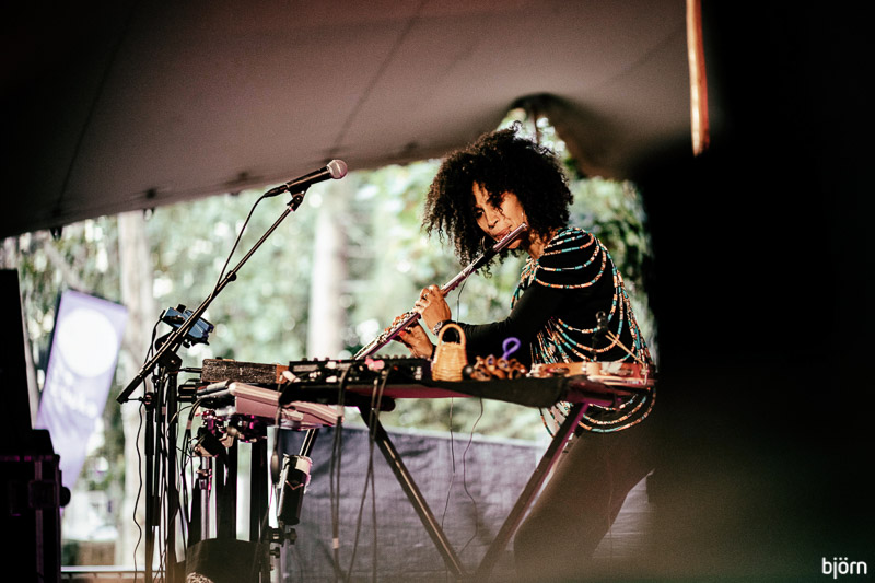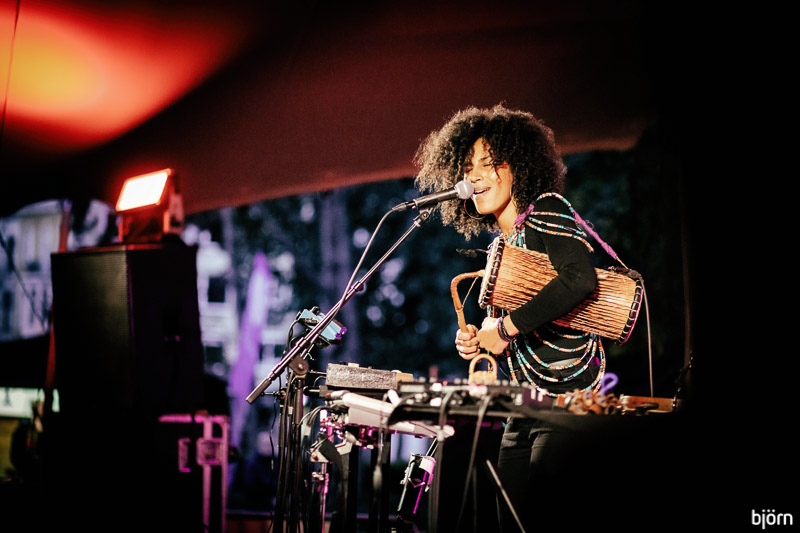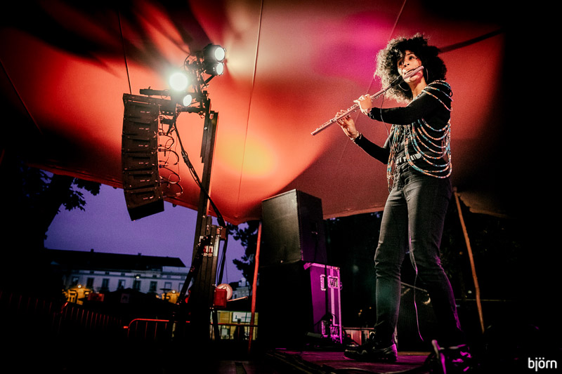 Esinam deed het traditiegetrouw solo. Ze maakt instrumentale muziek waarin improvisatie een belangrijke rol speelt en gebruikt daarbij allerlei percussie instrumenten, een synth, een looper en haar favoriete instrument de dwarsfluit. Ondanks problemen met een weerbarstige “looper” die weigerde te “loopen” en zo wat roet in het eten gooide, bracht Esinam opnieuw een interessante en bij momenten erg dansbare set met veel variatie en plaats voor improvisatie.