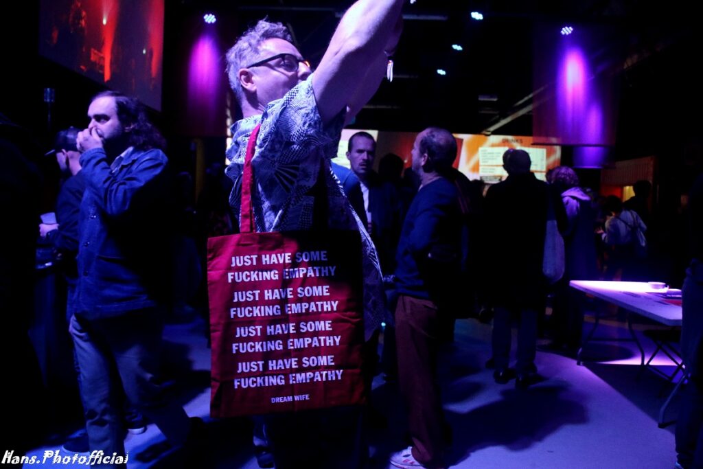 Social Lubrication is de naam van hun derde album, en het was ook het titelnummer dat de set opende. Hoekige riffs en een ritme dat zowel aan INXS als Garbage deed denken toonden meteen de richting die het optreden uitging, dikke pret en lekkere gitaarfun dus. In de nagalmperiode van de release van deze plaat brachten ze in september het nummer Love You More uit. Het was een zeldzaam rustpunt in een van energie barstend concert. De capriolen van Bella en Alice mogen nog zo spectaculair zijn, het is vooral de nooit aflatende glimlach, de erotische zelfverzekerde blik en de totale podiumcharmes tout court van frontvrouw Rakel die van Dream Wife droomwijven maakt. En vergis je niet, Rakel speelt geen typetje. Toen ze ons zag lopen in de wandelgangen (lopen was daar technisch lastig) met de plaat onder de arm kwam ze op een compleet vergelijkbare manier uit eigen beweging naar ons toe.
