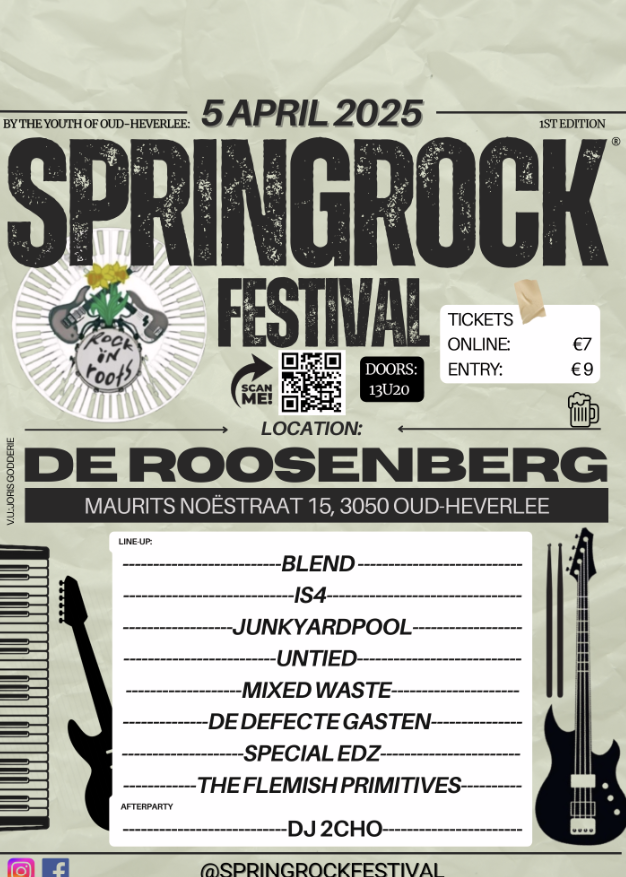 Ben jij een fan van krachtige rock, magische riffs en hard rijdende drums? Begin de paasperiode dan goed met het opkomende festival Springrock in zaal De Roosenberg, regio Leuven! Een groep enthousiaste jongeren bedacht dit geniale festival om opkomende bands een podium te geven, wat de perfecte voorproef is voor zowel de artiesten als het publiek, vlak voor het festivalseizoen. Springrock heeft zijn naam te danken aan de Engelse term voor lente, gecombineerd met de Vlaamse betekenis van “springen” – een knipoog naar de energie van het festival, want met deze krachtige rock en punk kun je niet stilzitten!