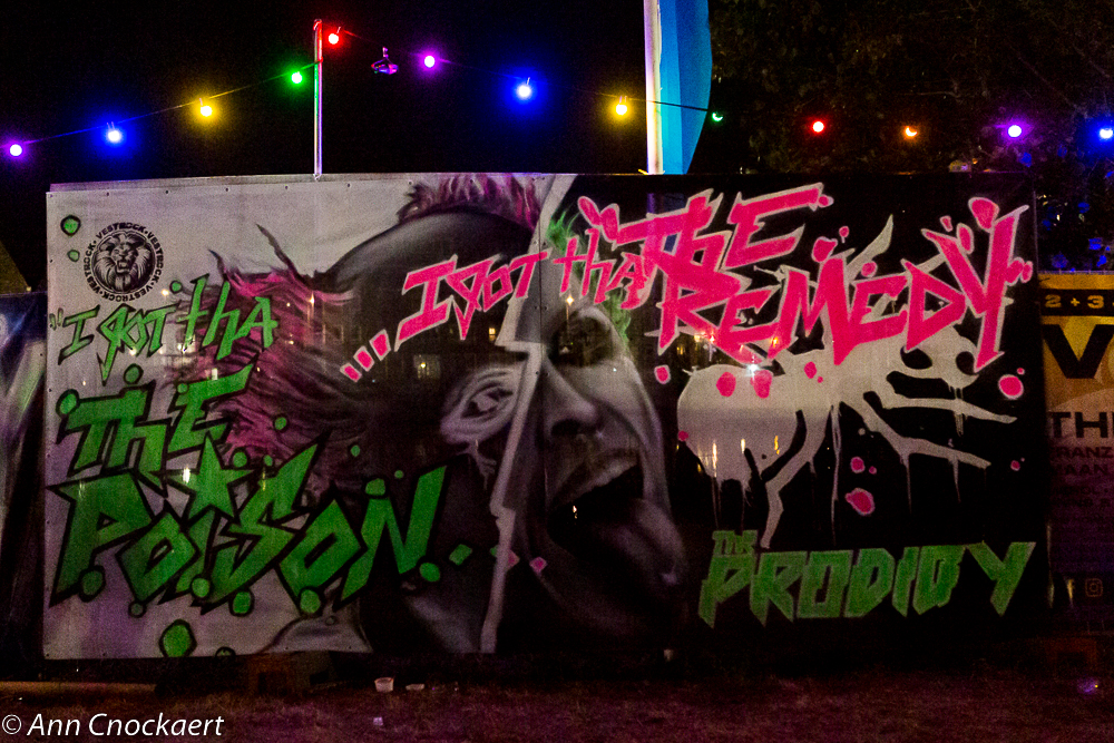 The Prodigy, dan? Die bestaan nog, zelfs na het overlijden van Keith Flint (toch de smoel van die band) en hun set was alles wat je er kon van verwachten: de apocalyps op uitbreken, het gedonder en geraas van een nieuwe, nog aan te komen dystopische wereld. Helaas hadden de heren geen zin in foto’s. Dus namen we maar deze van een mural. Goed, Vestrock: dat het goed was. Tot volgend jaar. Als we nog leven.