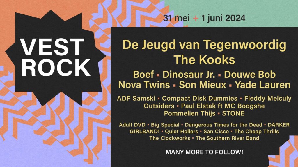 VESTROCK festival vindt plaats op een prachtig eiland in de stadsgracht van de Middeleeuwse vestingstad Hulst (Zeeuws-Vlaanderen). Op vrijdag 31 mei 2024 en zaterdag 1 juni 2024 kan je er naar de dertiende editie. Het festival had reeds aangekondigd dat Dinosaur Jr., STONE, Compact Disk Dummies, The Clockworks, Big Special, San Cisco, Quiet Hollers, Son Mieux, De Jeugd Van Tegenwoordig, Paul Elstak feat. Mc Boogshe, Pommelien Thijs, The Cheap Thrills, DARKER, Dangerous Times For The Dead, Adult DVD, Fleddy Melculy, ADF Samski, Yade Lauren, Douwe Bob en Boef zullen afzakken naar de Zeeuwse vestingstad.