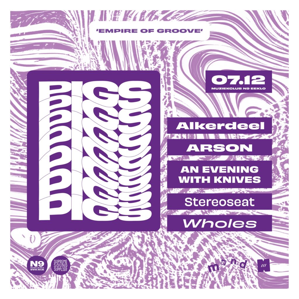 De affiche bestaat uit 6 bands die ook onze nieuwsgierigheid opwekken. Pigs Pigs Pigs Pigs Pigs Pigs Pigs uit Newcastle brengt een mix van stoner, metal en noise. Hun vierde album Land of Sleeper verscheen in februari van 2023 op Riot Recordings. Het Britse vijftal stond eerder al op Desertfest Antwerpen en Berlijn, en brengt zijn energieke liveshow nu in Eeklo.