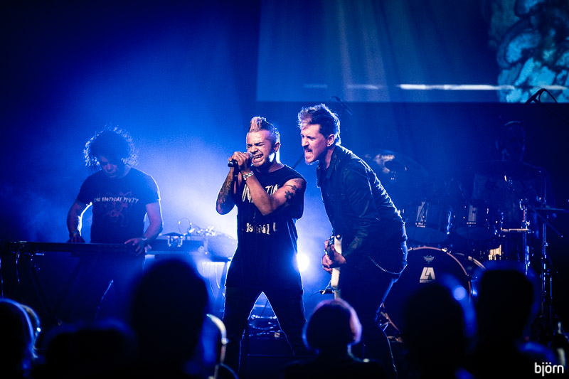 Met knappe visuals in evil mandala-stijl op de achtergrond, kregen we van Inertia op het Wave Cave-podium stevige elektro/industrial darkpoprock te horen. De band rond zanger Reza Udhin draait al meer dan 25 jaar op volle toeren. Hoewel hij niet de meest toonvaste livezanger was, kregen we toch een sterk optreden te zien. Een instrumentaal sterk kader, werd neergezet door de indrukwekkende drummer met de heerlijke glimlach Blue Jigsaw, de energieke gitarist Ollie Cater die bekoorlijke solo-stukken poneerde en synthwonder Andrew Lowlife. Naast eigen nummers kregen we ook een enorm mooie coverversie van Games Without Frontiers (Peter Gabriël) te horen. Het werd een stomende show, wanneer Ollie met zijn gitaar het publiek in sprong. Hij deed er een tochtje door de luisteraars tot halfweg de hal. Deze band straalde zoveel uit vanavond. Warmte, appreciatie en passie! Enkele uurtjes later, kregen we ook de kans om met de heren van Inertia een salonmomentje te hebben. Lees binnenkort dus ook ons interview op de website.