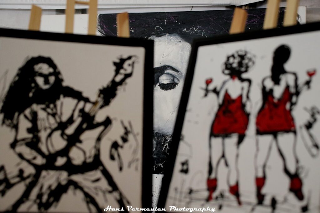 Tussen de optredens door mochten we ook kennismaken met de Nederlandse kunstenares Judy Van Meteren. In de VIP-tent stelde ze haar schilderijen van artiesten tentoon. Zo hing er er knap werk van de dame, met portretten van Prince, David Bowie, Queen, Bob Marley, Rolling Stones, The Jacksons, … Ze maakte ter plaatse ook een ‘dripping art painting’. Slierten zwarten verf laat ze op het witte doek druipen, waardoor een verfschets ontstaat. Haar werken kan je herkennen aan haar naamtekening, waar ze telkens ook een muzieknootje bij zet, als verwijzing naar haar overleden vader, die muzikant was.