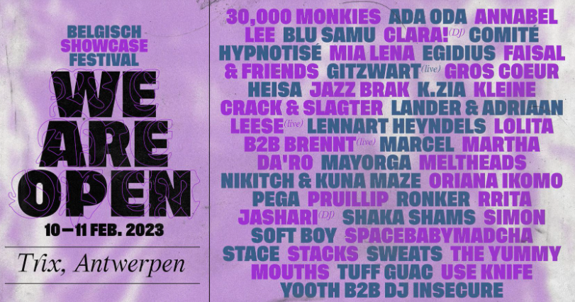 Op 10 en 11 februari 2023 vindt de veertiende editie plaats van het Belgische showcase festival We Are Open in het Antwerpse muziekcentrum Trix.