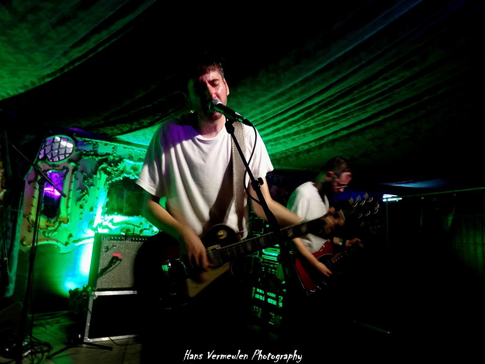 Isa Holliday (what a great name) uit Manchester en haar drie kornuiten uit Leuven sprongen op de shoegaze/postpunk/indierock-trein waar mythische bands als Ride, My Bloody Valentine en Slow Dive al een tijdje waren opgesprongen. Die bands niét citeren om duiding te geven bij de sound van Slow Crush is onmogelijk en de band zelf beseft dit ook. Isa’s frêle stem (denk aan The Cranes) kwam onvoldoende aan de oppervlakte in de broeierige brij van de Spiegeltent maar ze compenseerde dit ruimschoots door wijdbeens vol gas te geven wat een uitstekende sound opleverde. Een volle tent werd zo genadeloos op kookpunt gebracht voor de storm die Crowd Of Chairs zou ontketenen. In ieder geval maakte Aurora ‘furora’.
